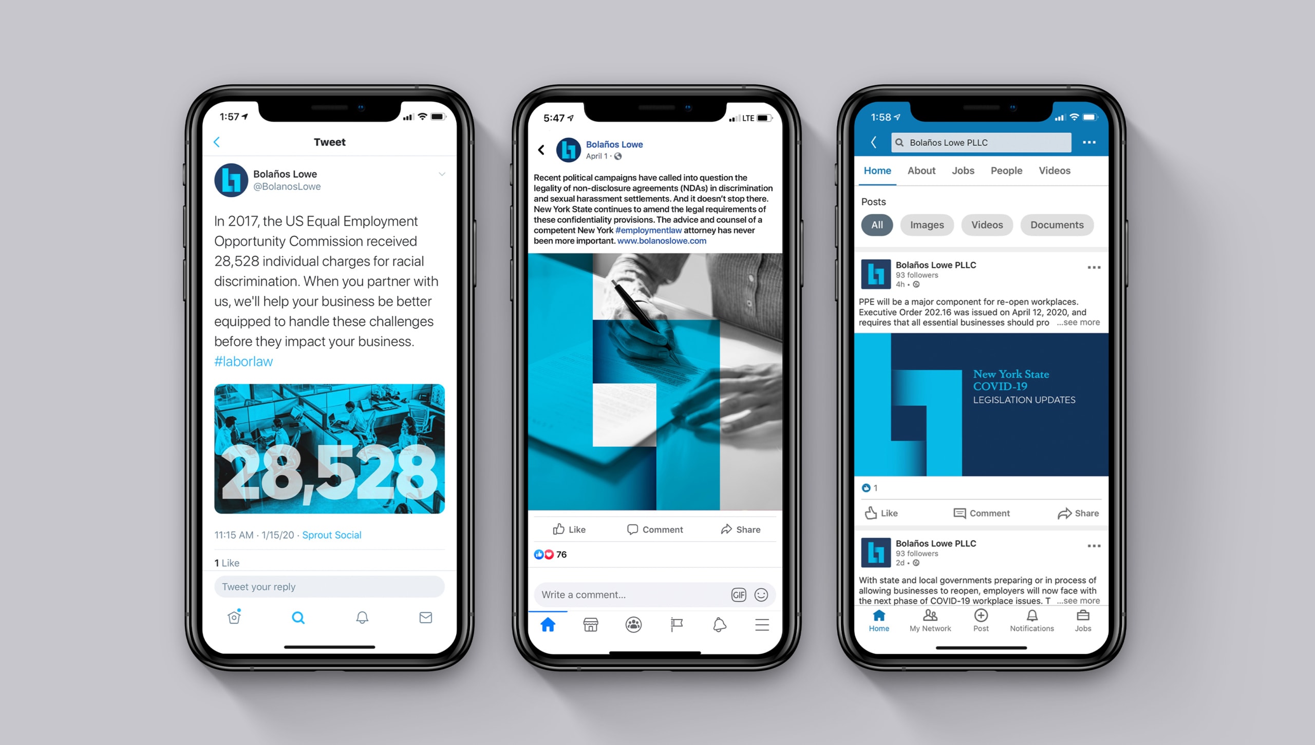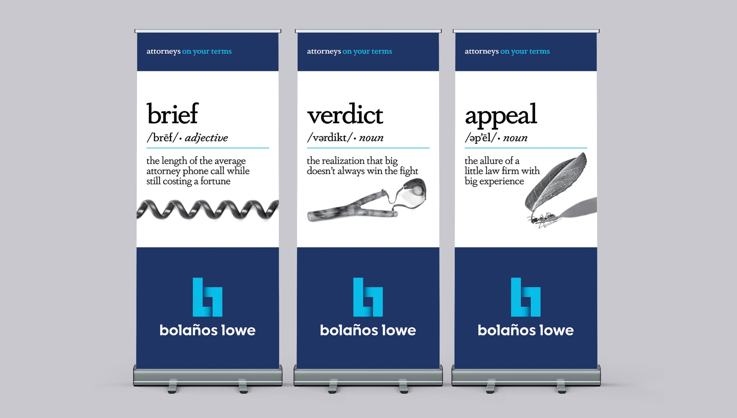 Guided by that insight, our team developed a powerful brand that touched on what people dislike about most law firms alongside what they want to find in a partnership. This allowed us to put Bolaños Lowe in the sweet spot where little and mighty meet to the benefit of every client. Using our integrated approach, we executed tactics that position the brand as being powerfully attractive to potential clients who won’t know what they want in a firm until they see it—until they see Bolaños Lowe.