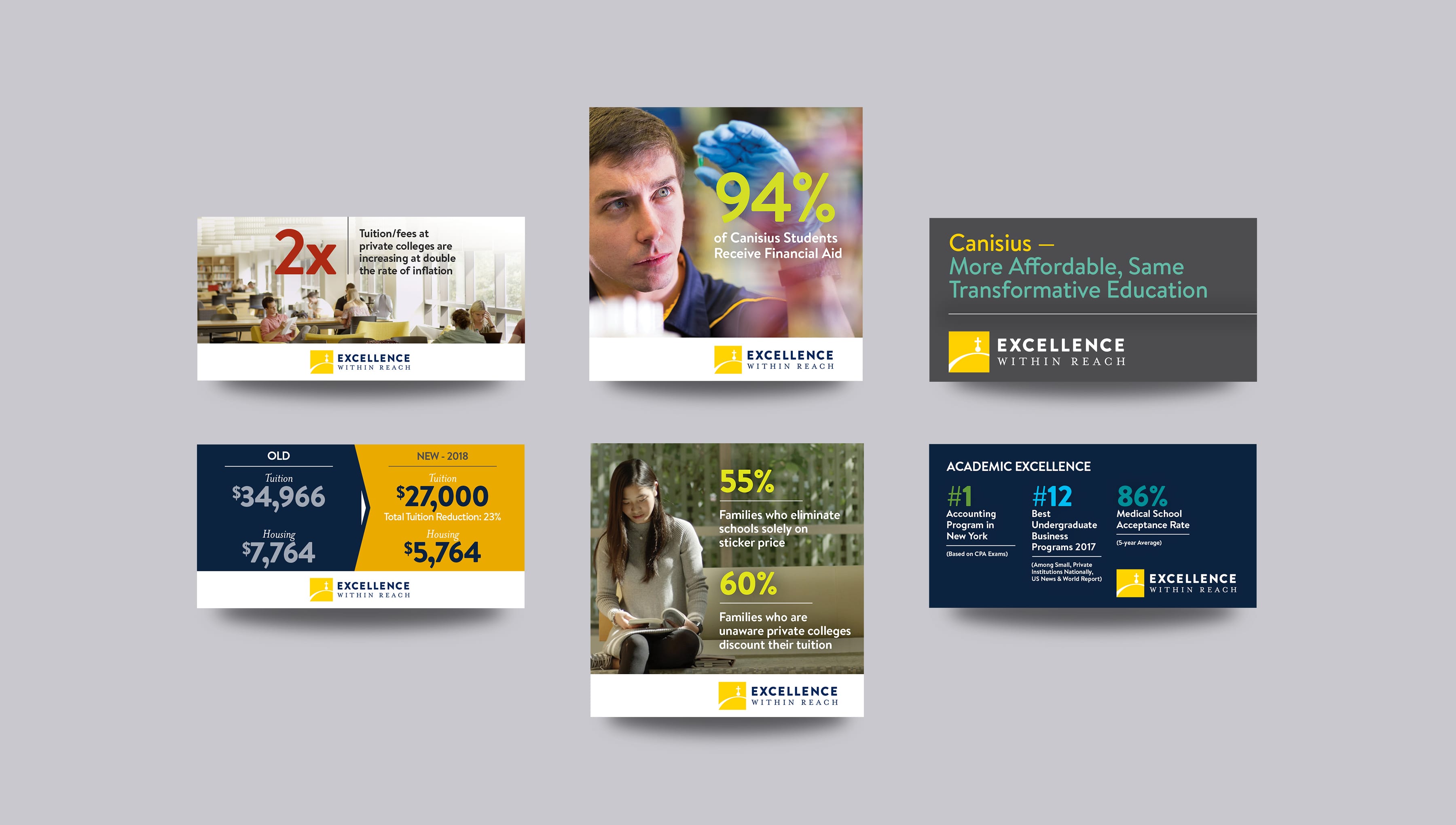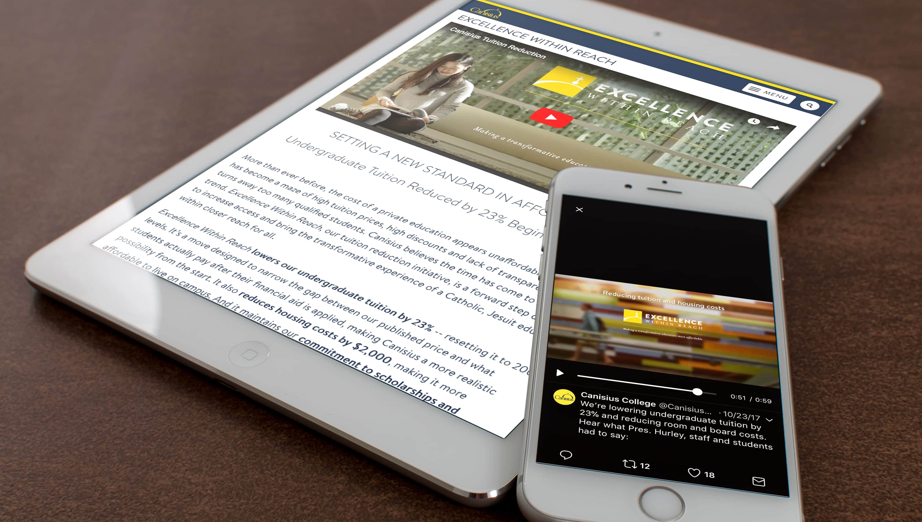 In response to declining undergraduate applications and the rising cost of college tuition, Canisius College developed an initiative designed to make their world-class education more affordable for students and families. This program reduced their tuition by 23% (returning it to what it was in 2008) and their housing costs by $2,000. To ensure the successful launch of this new initiative, Canisius enlisted the help of The Martin Group. We began by branding the initiative as “Excellence Within Reach” to emphasize both the tuition reduction and the quality of a Jesuit education at Canisius.