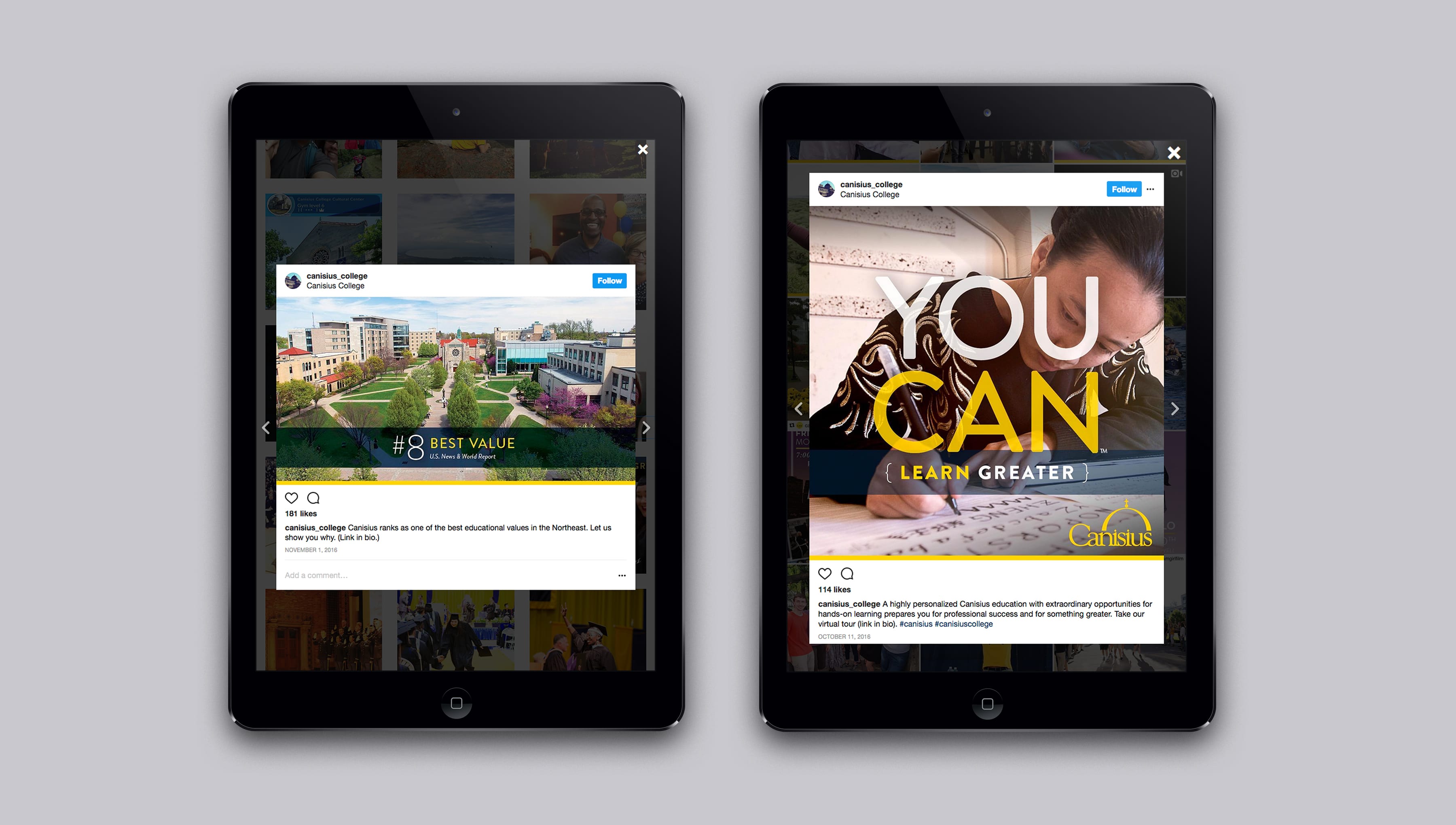 Our team hit the ground running with a full suite of creative tactics, including print, digital and social media executions (Twitter, Instagram and Facebook), as well as radio spots that played on Pandora. We also created a series of videos—appearing on social media and the Canisius website—that used student interviews to highlight important components of the Canisius educational experience.