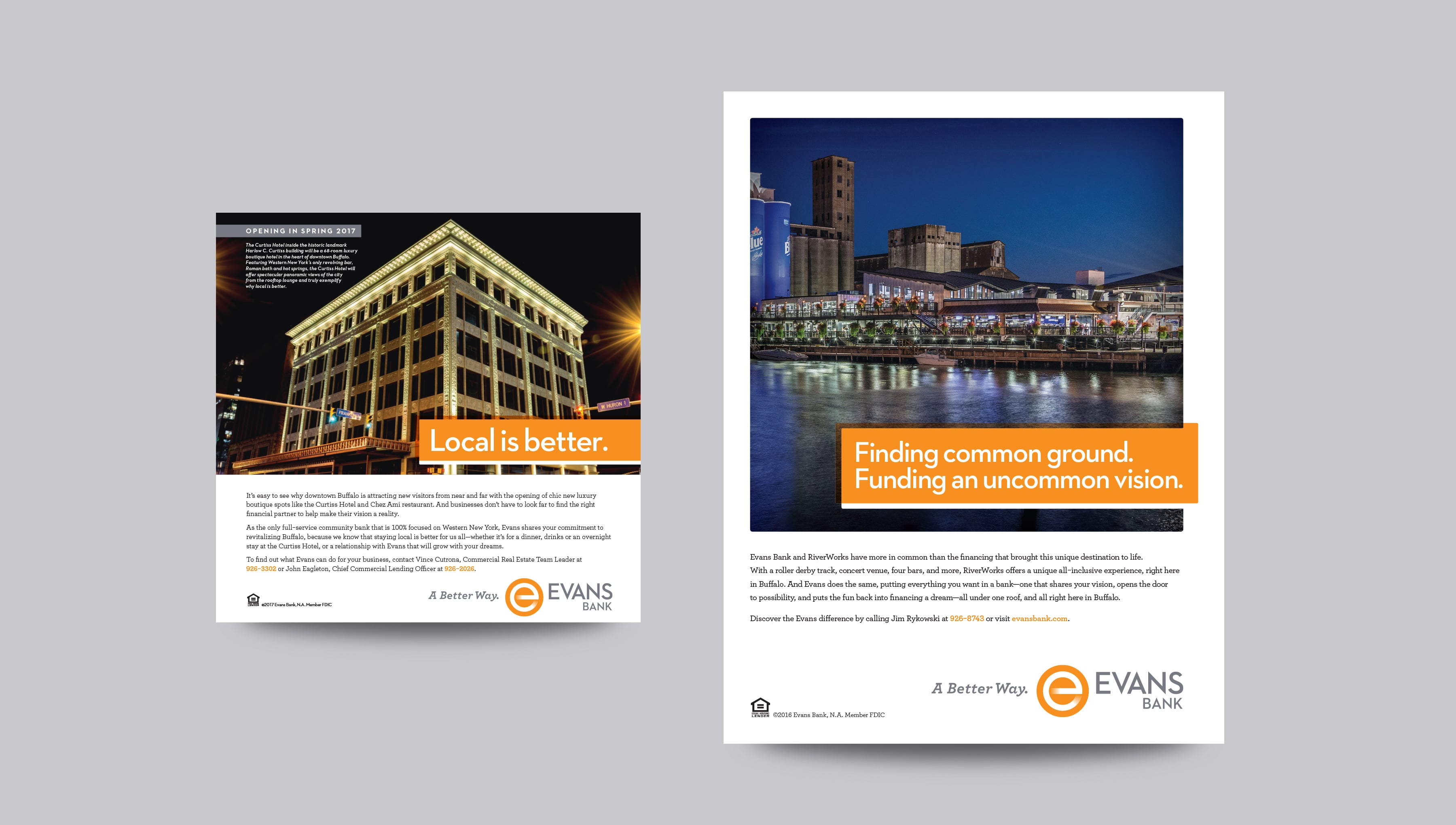 With nearly a century of community banking in Western New York, Evans Bank needed a full-scale brand refresh that would leverage its history and highlight its distinct position as the local bank with community ties and a customer-focused way of doing business. The bank was also looking to capitalize on the departure of Greater Buffalo Savings Bank and facing competition from national bank chains coming to town. To combat the competition, we needed to leverage the Evans’ motto of “A better way” to let Western New York know that—as new banks come and go—Evans in the only bank in town that provides both neighborhood service and comprehensive financial solutions.