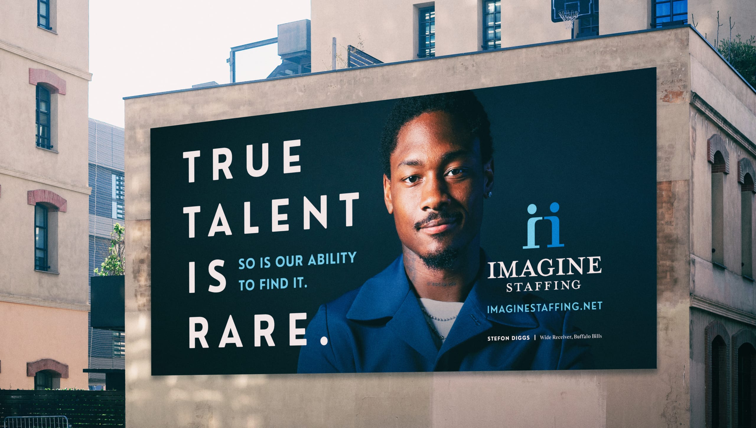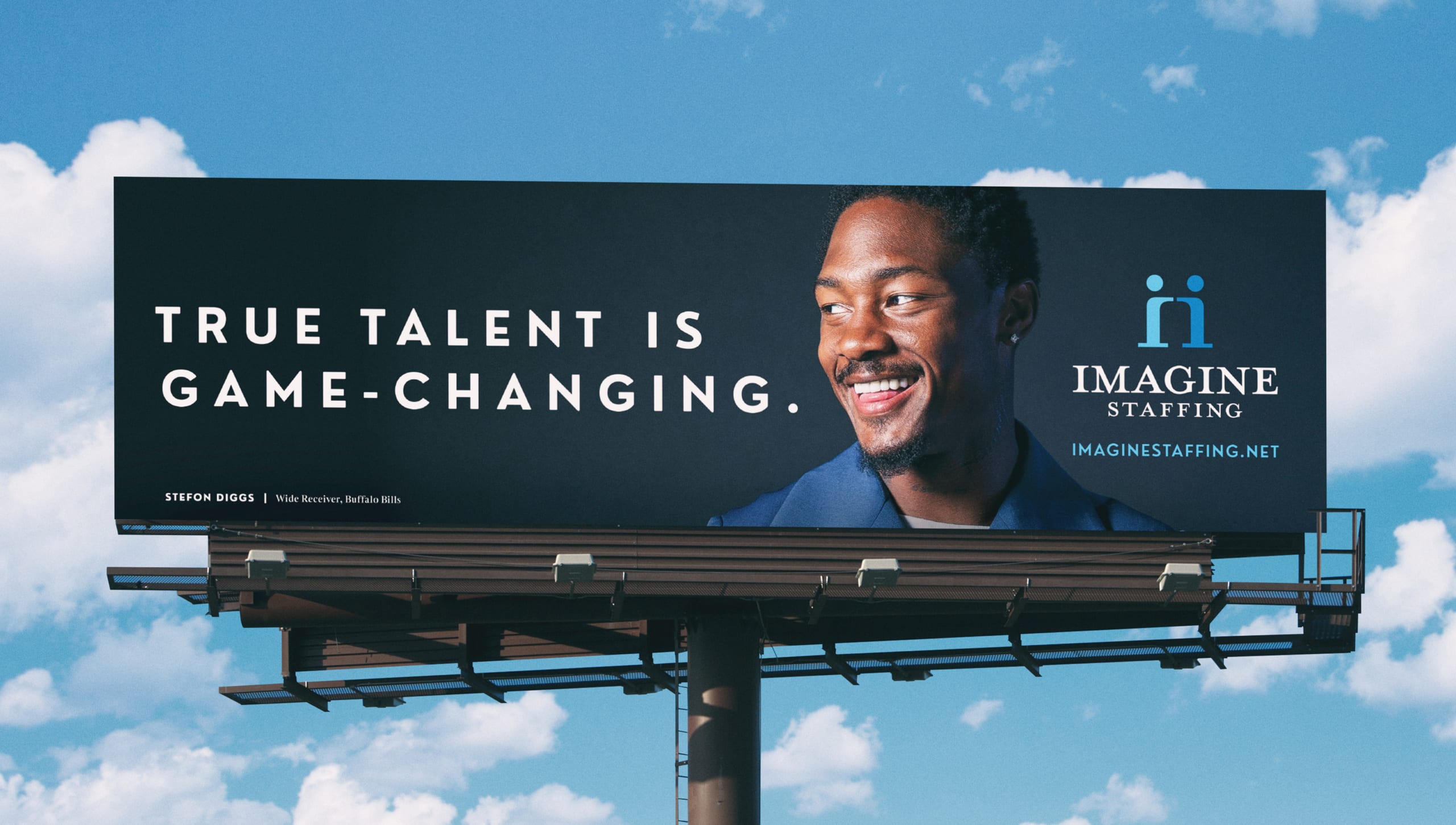 From up-and-coming entrepreneurs to Fortune 500 powerhouses, Imagine Staffing has changed the game on a local, national, and international level when it comes to recruitment and talent acquisition, recruitment process outsourcing, and managed service programs. With a one-of-a-kind opportunity to build a campaign featuring Stefon Diggs, wide receiver for the Buffalo Bills, the IS team turned to ours to gain awareness and action from leadership and decision makers. We recommended a two-phase approach: the first featuring a professional look and feel to specifically speak to target audiences, and a more community-minded second to engage all of Western New York. We created a thematic to extend across both: speaking to the idea that true talent, represented by Diggs himself, may be difficult to find—but that Imagine Staffing is just the agency to find it and help organizations build the best team as a result. The campaign came to life across TV spots featuring Diggs, as well as supporting radio, print, outdoor, and digital advertising. The campaign yielded more than 7 million monthly impressions, an increase in web sessions, higher click through rates, and a greater affinity and awareness of Imagine Staffing throughout the region.