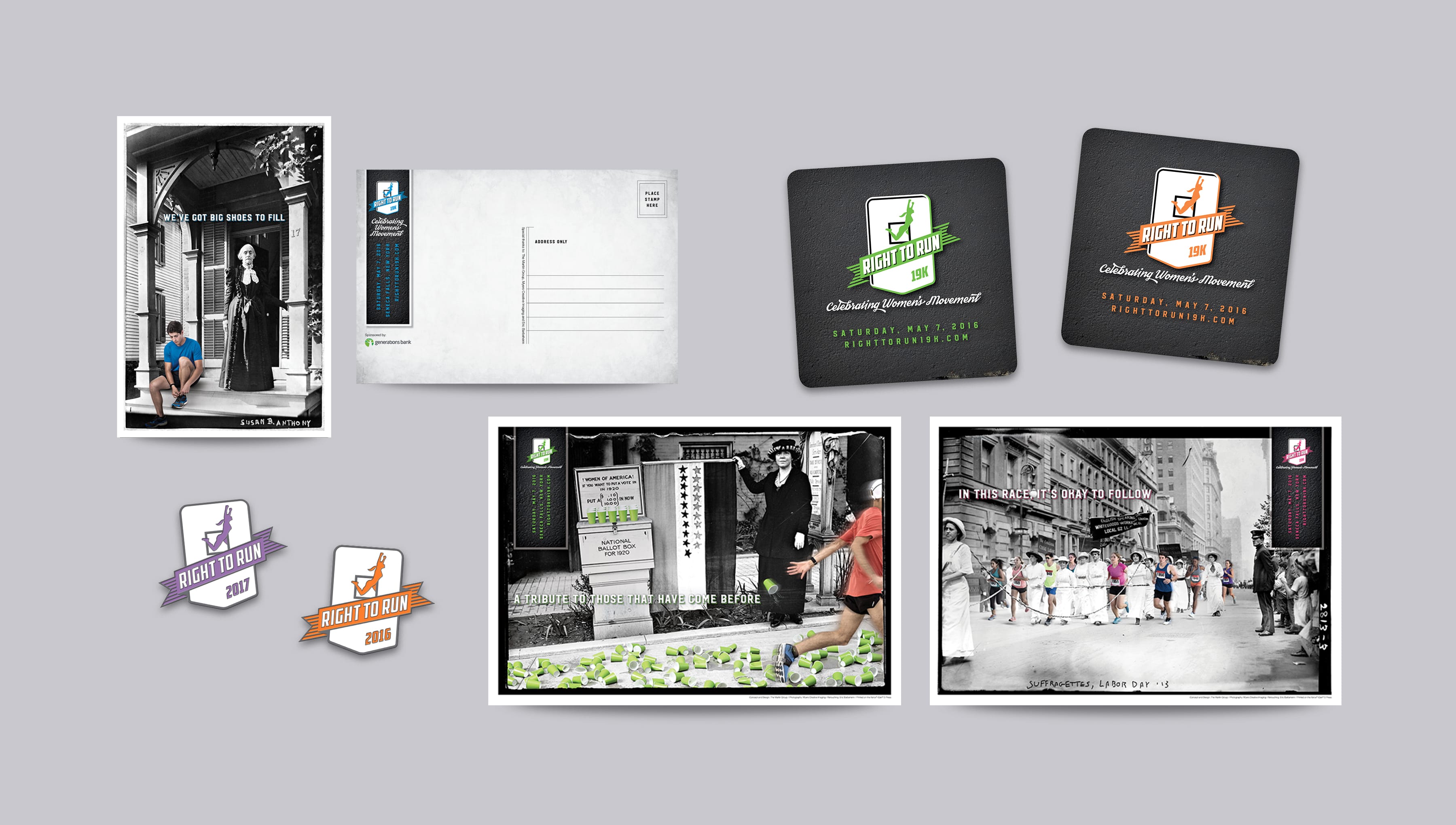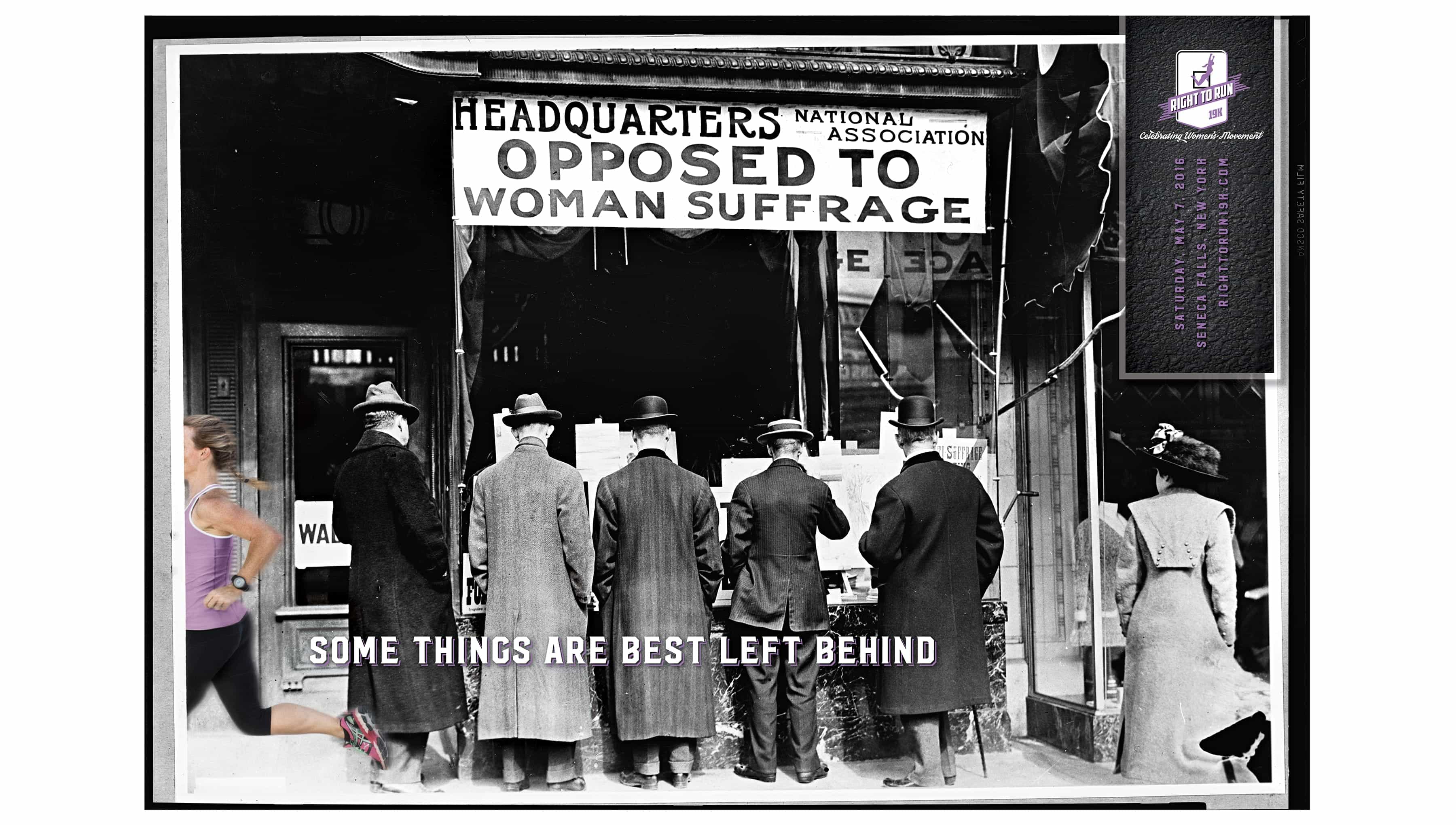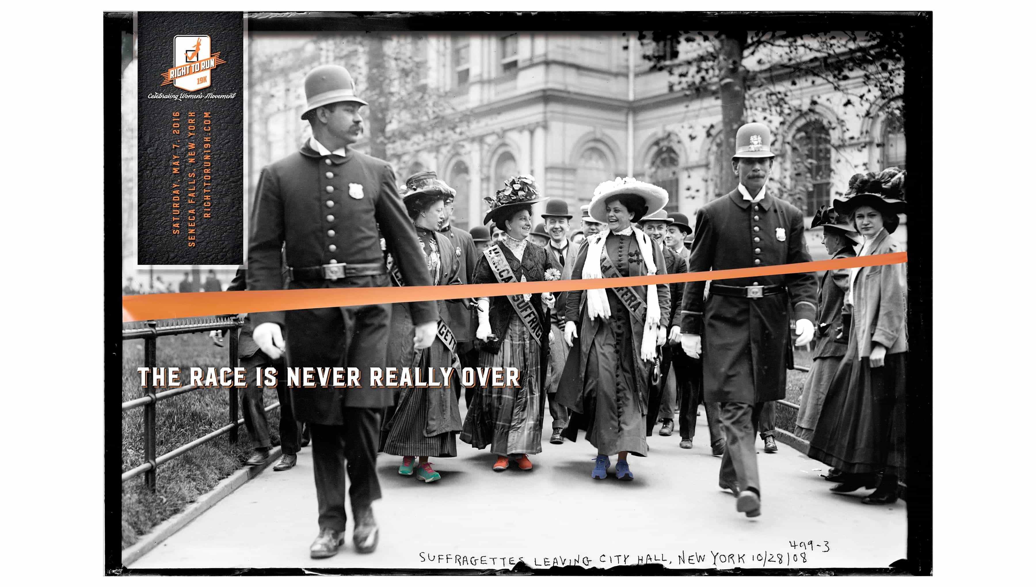 The Right to Run 19K is a road race that pays homage to the 19th Amendment, which granted women the right to vote, and raises funds to transform the historic Seneca Knitting Mill into the new Center for Great Women. We created the brand for the inaugural run, adding modern elements and messaging to historic photography of the suffrage movement to connect today to the struggles and triumphs of the women who came before.