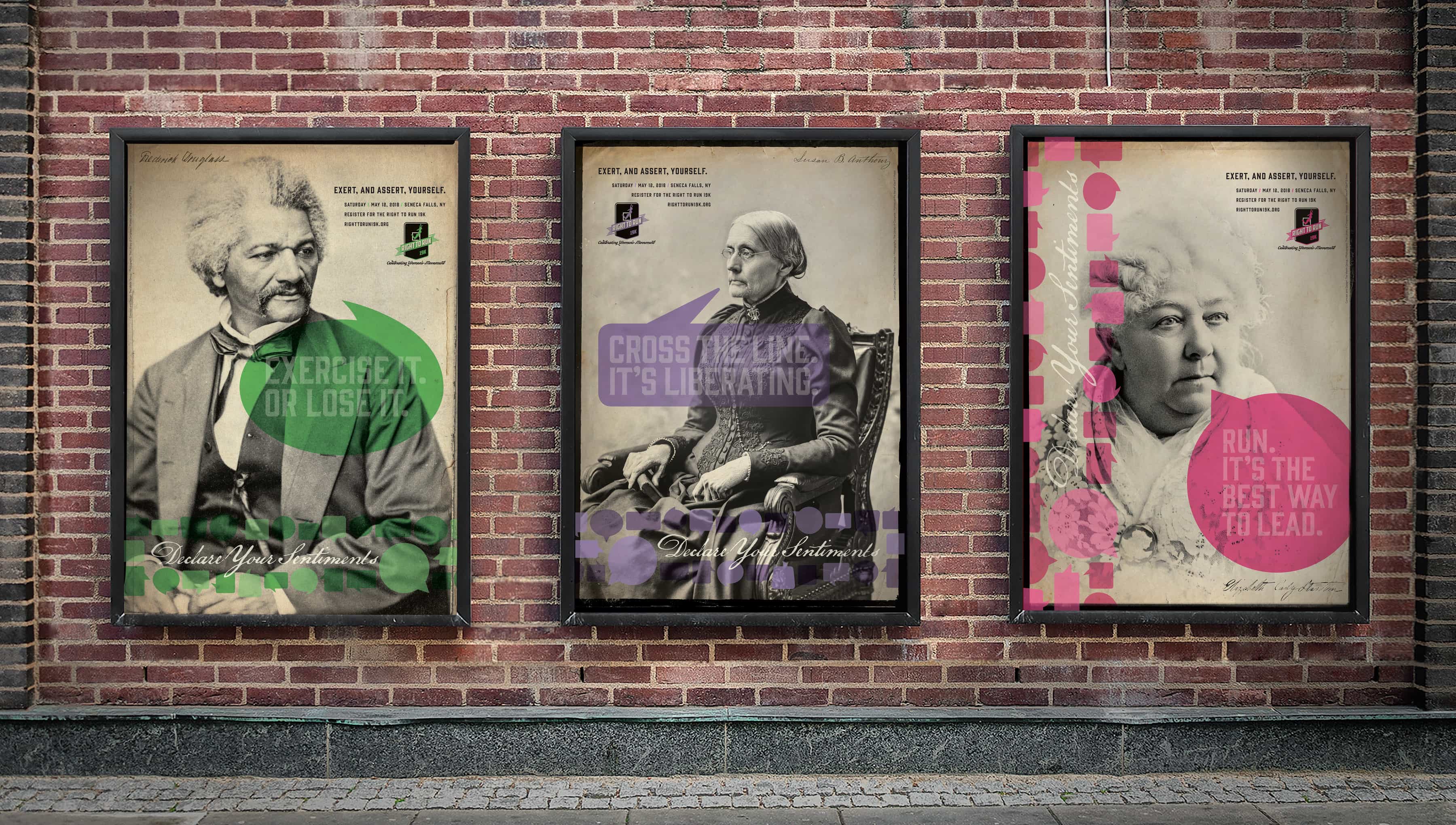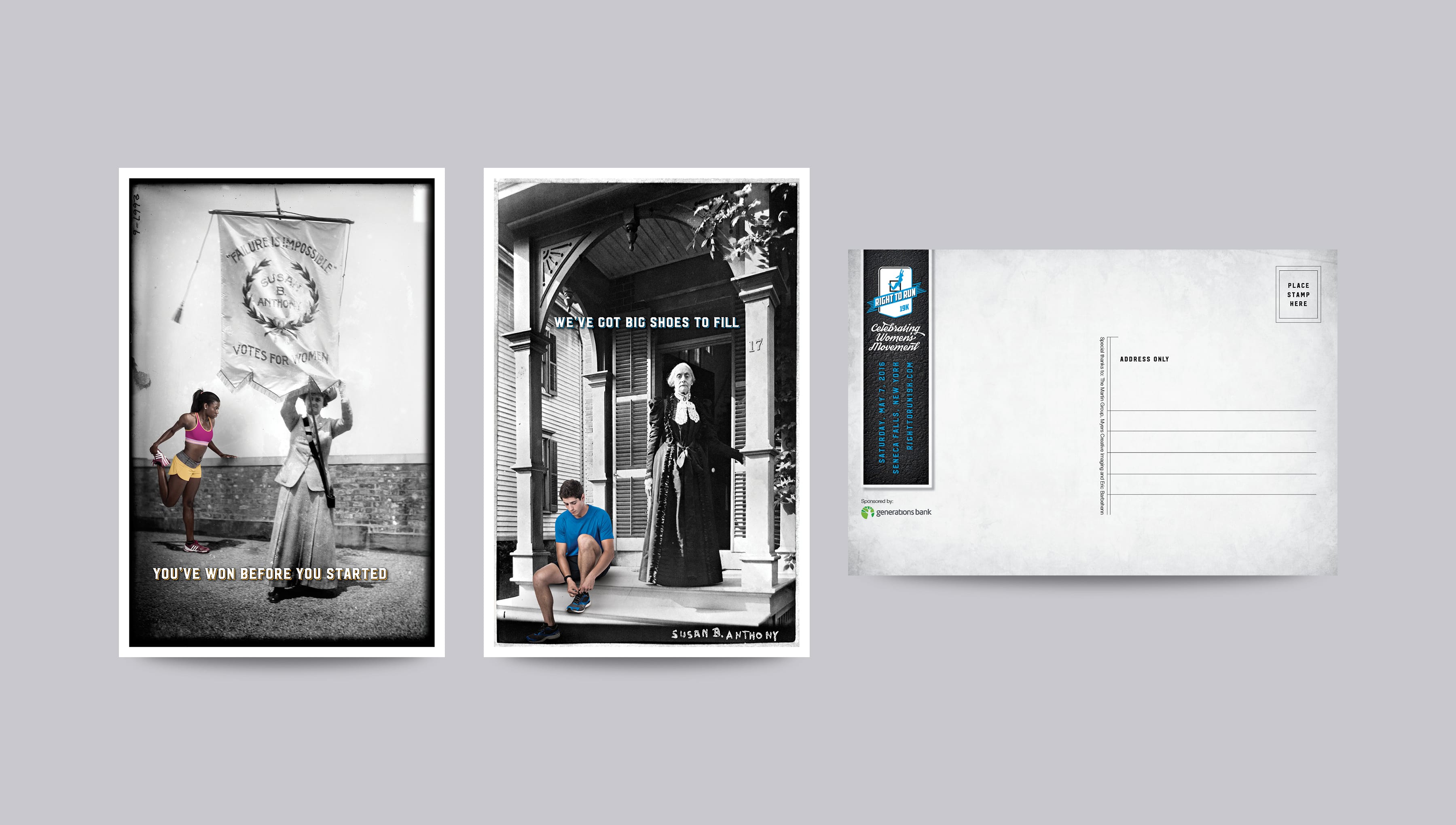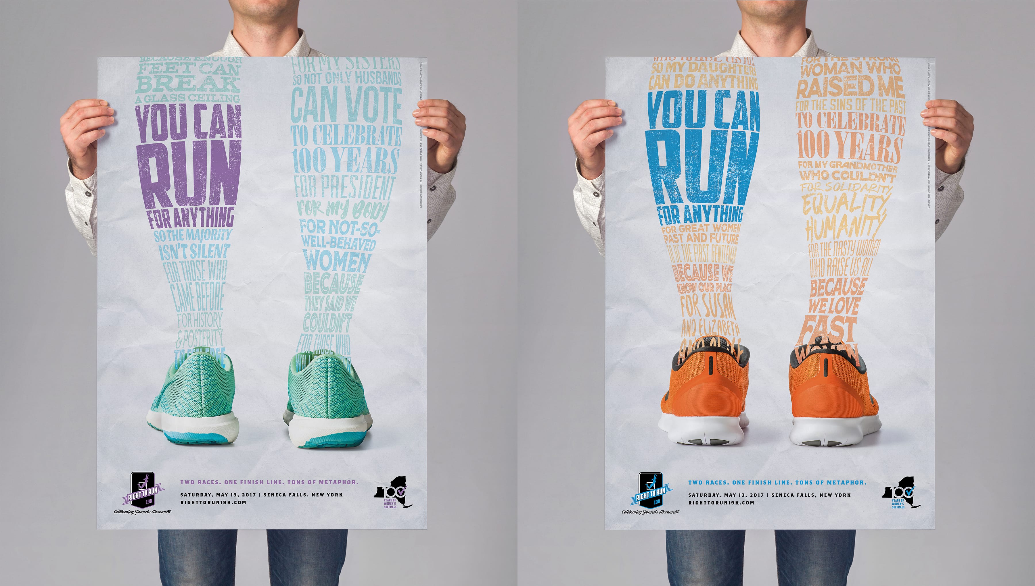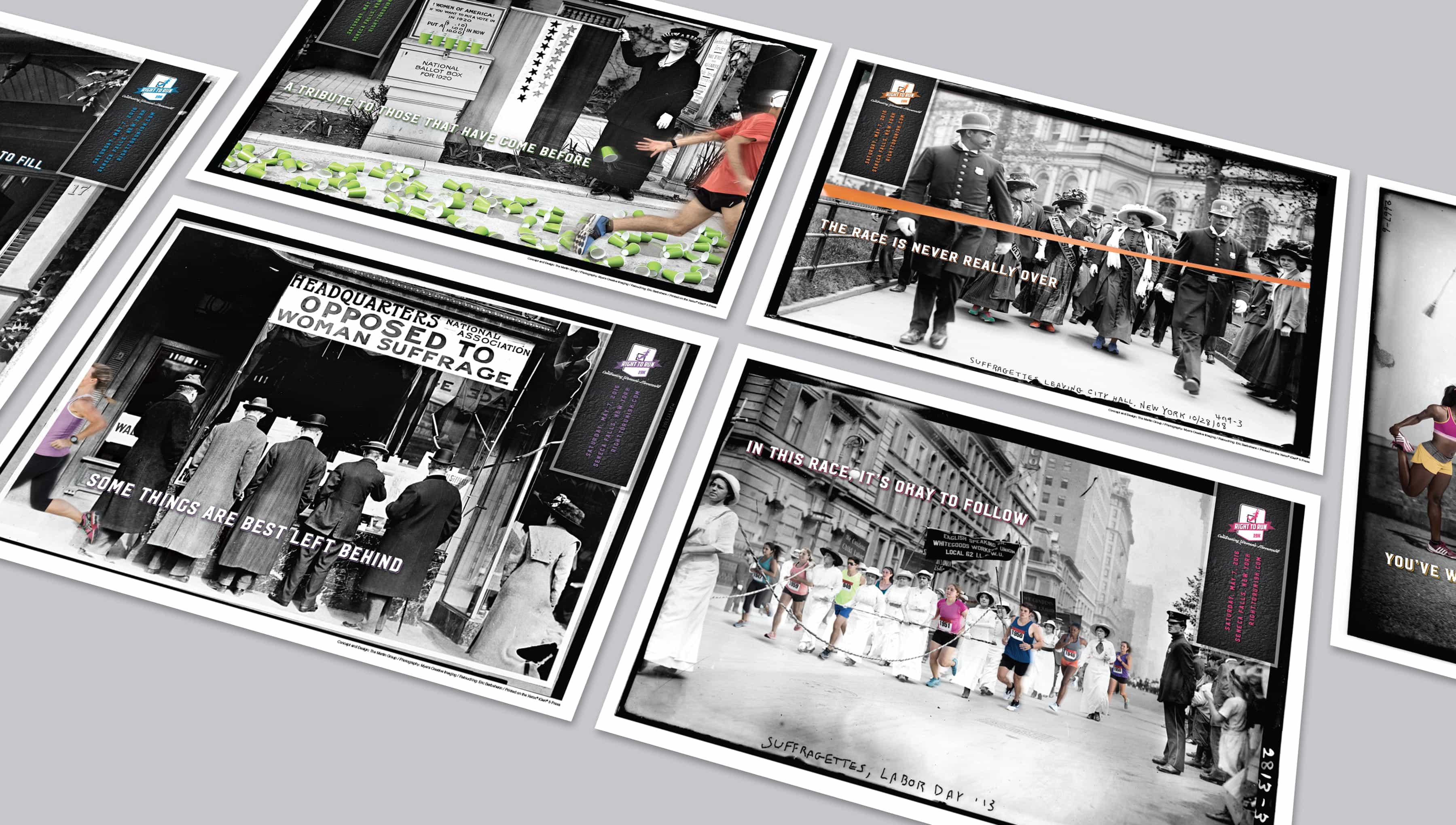 The Right to Run 19K is a road race that pays homage to the 19th Amendment, which granted women the right to vote, and raises funds to transform the historic Seneca Knitting Mill into the new Center for Great Women. We created the brand for the inaugural run, adding modern elements and messaging to historic photography of the suffrage movement to connect today to the struggles and triumphs of the women who came before.