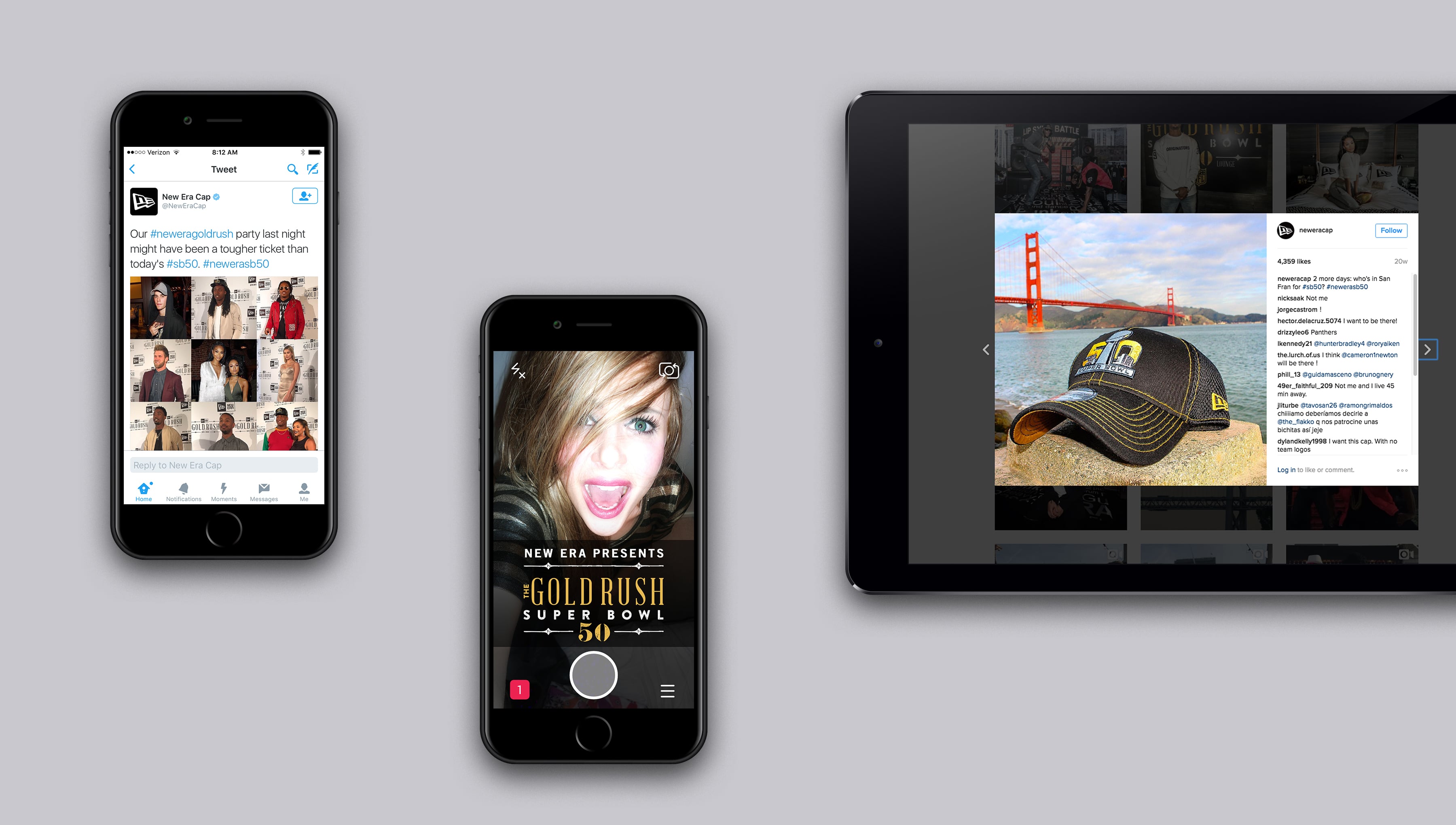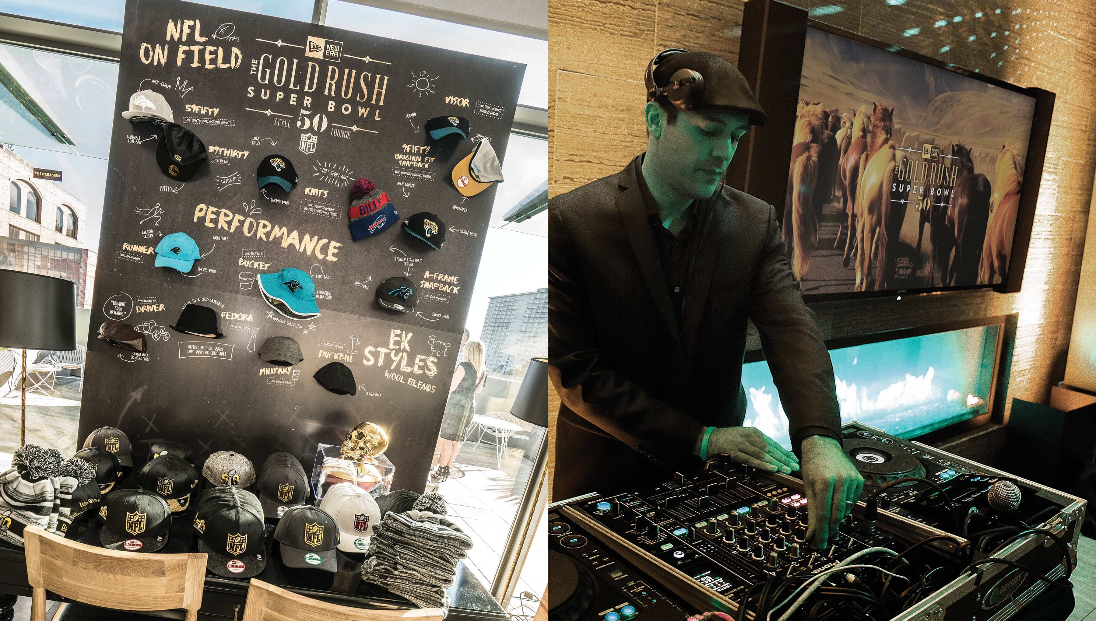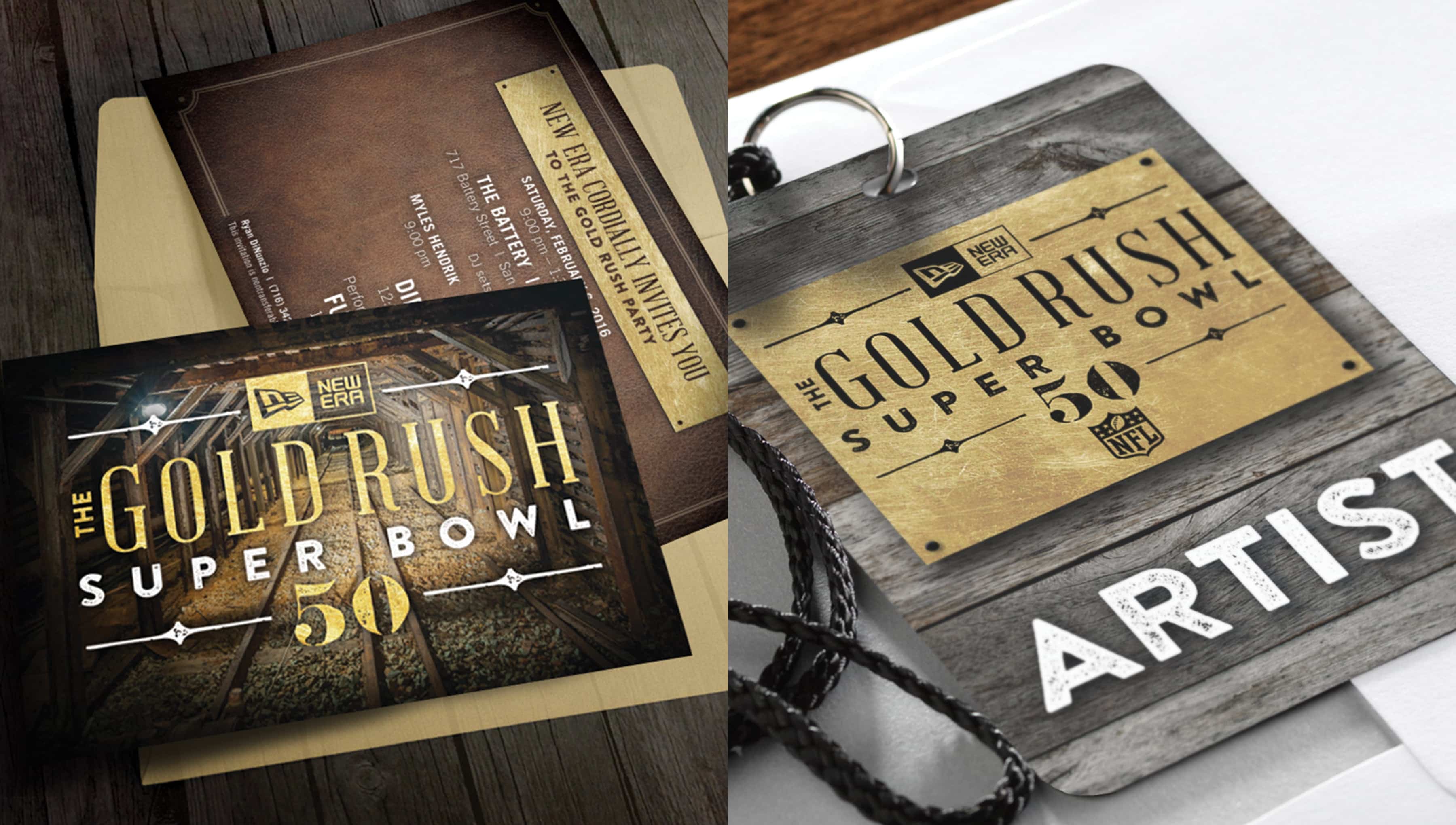 Staged at The Battery in San Francisco, CA, our creative was inspired by the big game’s Bay Area location and its “Gold Rush” history, along with the NFL’s golden 50th anniversary season. Taking a subtle approach with a limited gold and black palette and subdued archival imagery, our winning designs let New Era celebrate Super Bowl 50 in style. On site, our social media team quarterbacked Instagram, Twitter, Snapchat and Periscope for New Era, capturing behind-the-scenes photos and videos from throughout Super Bowl Weekend and generating more than 95 million impressions on #newerasb50.
