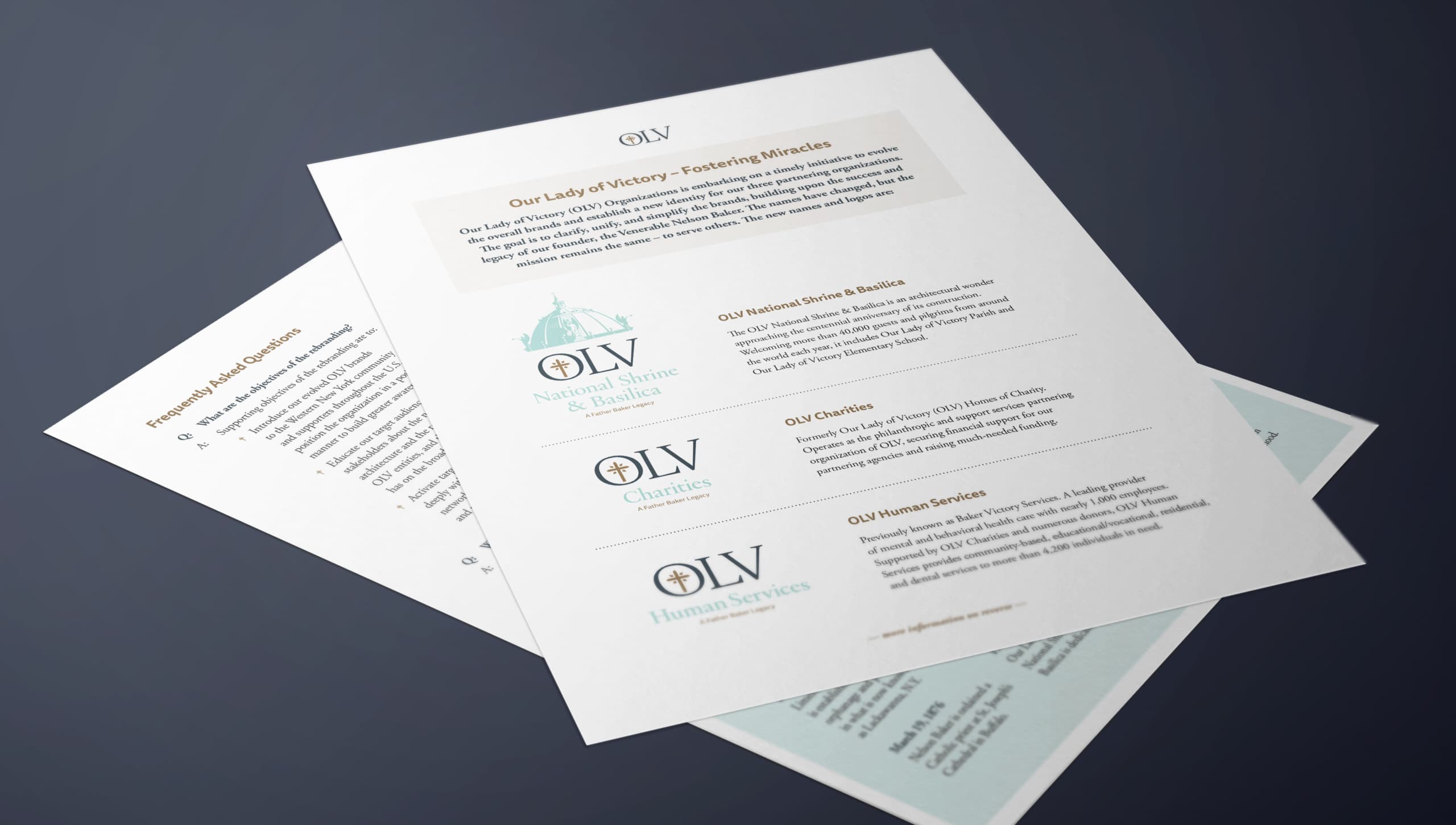 Following extensive research into the awareness, attitudes, and perceptions of each organization, our team developed a structural brand architecture that elevated the work of Father Baker as the unifying thread between the organizations. To establish consistency, each brand would lead with OLV, finish with “A Father Baker Legacy,” and share the same cross icon and color palette. This evolution of their established brands is expected to strengthen OLV’s position in the marketplace and create long-term sustainability for the three partnering organizations.