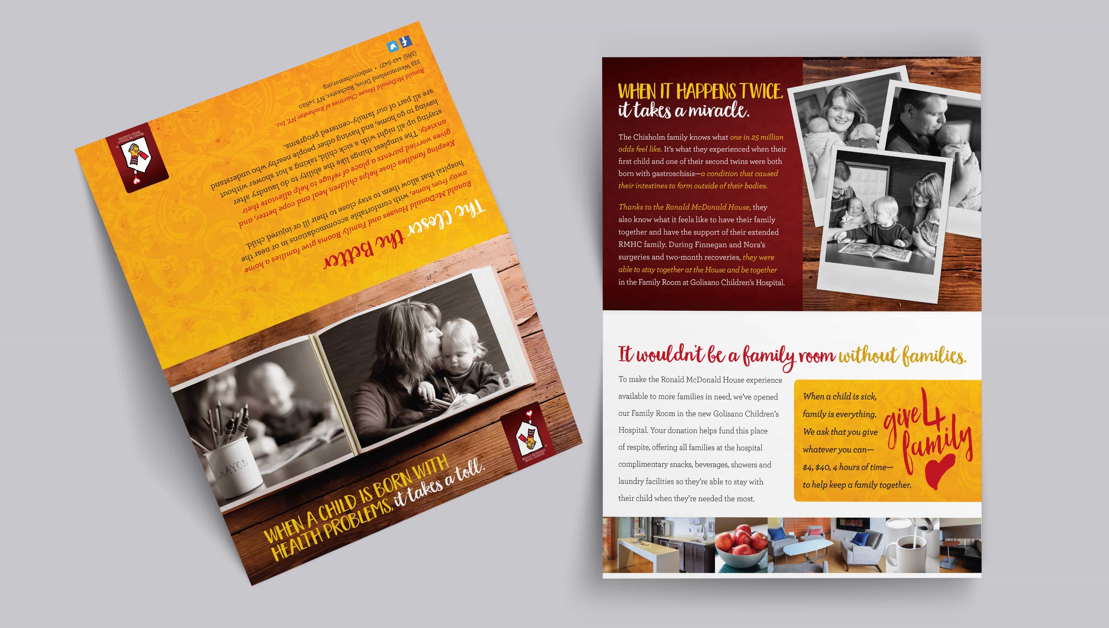 The Martin Group worked with RMHC to create the direct mail piece for their annual appeal—one of the organization’s main fundraisers. We brought the house to life, featuring the heartwarming story of a family helped by RMHC, and showcased the unique benefit it offers the community: giving families a close, comfortable and affordable place to stay while their child receives the critical medical care they need.