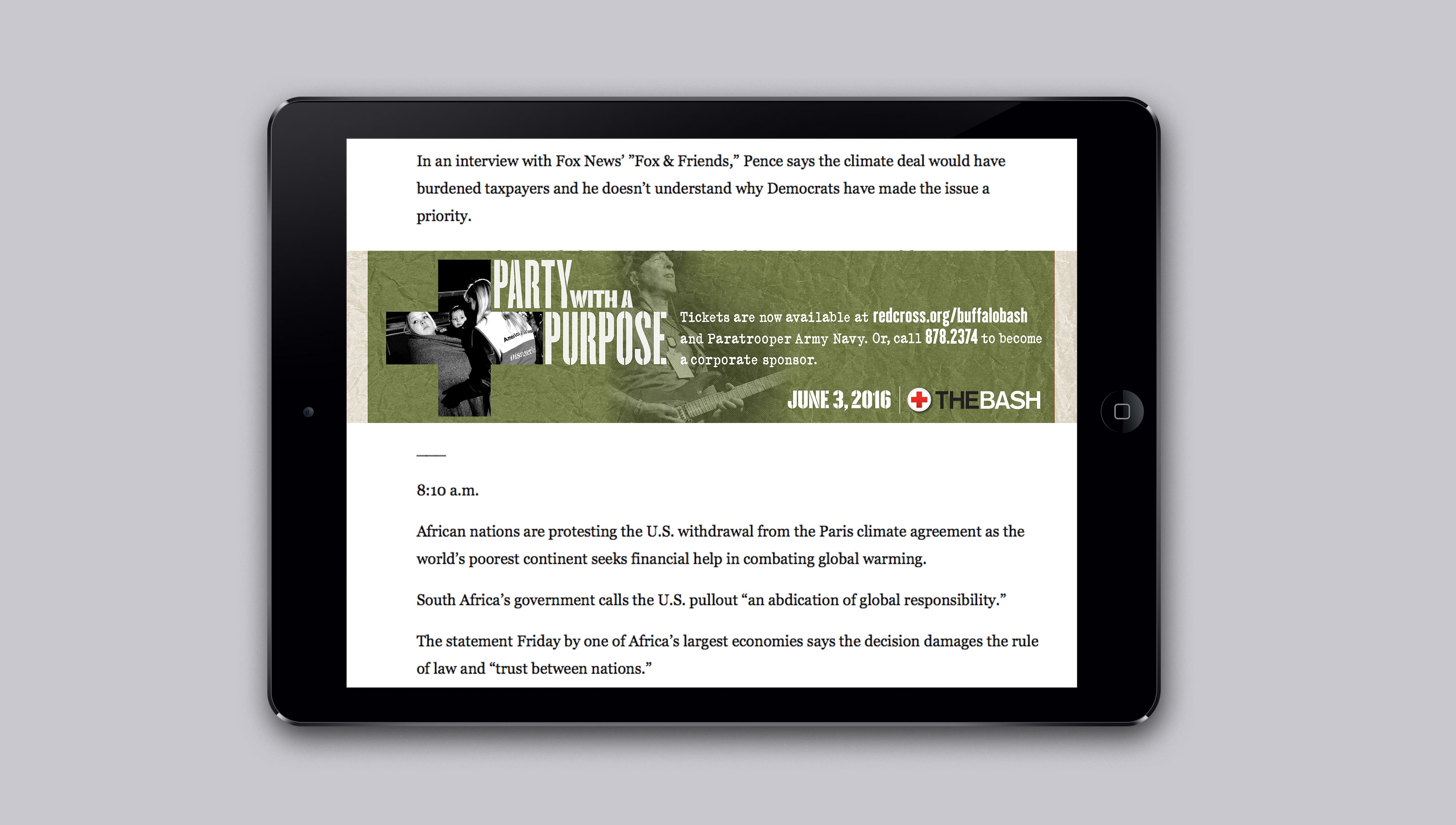 The Bash, the popular annual fundraiser for the Western New York Chapter of the American Red Cross, is a favored cause supported by TMG, going back many years. Our creative centers around its longstanding military theme and its well deserved reputation as one of WNY’s biggest events. A combination of digital and outdoor tactics helped get the word out and drive the community online to buy their tickets.