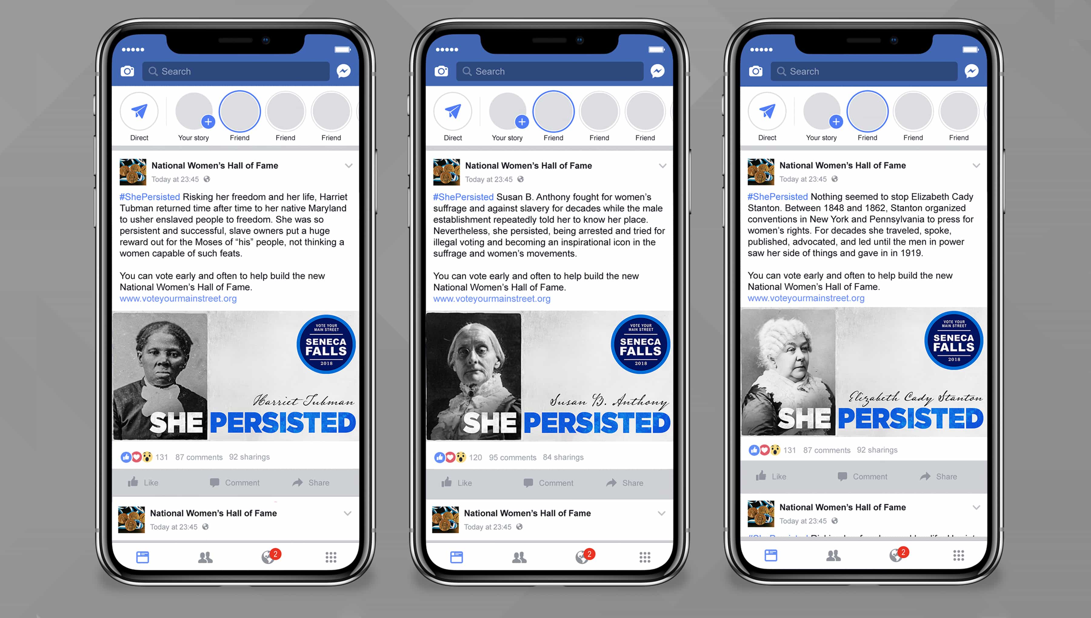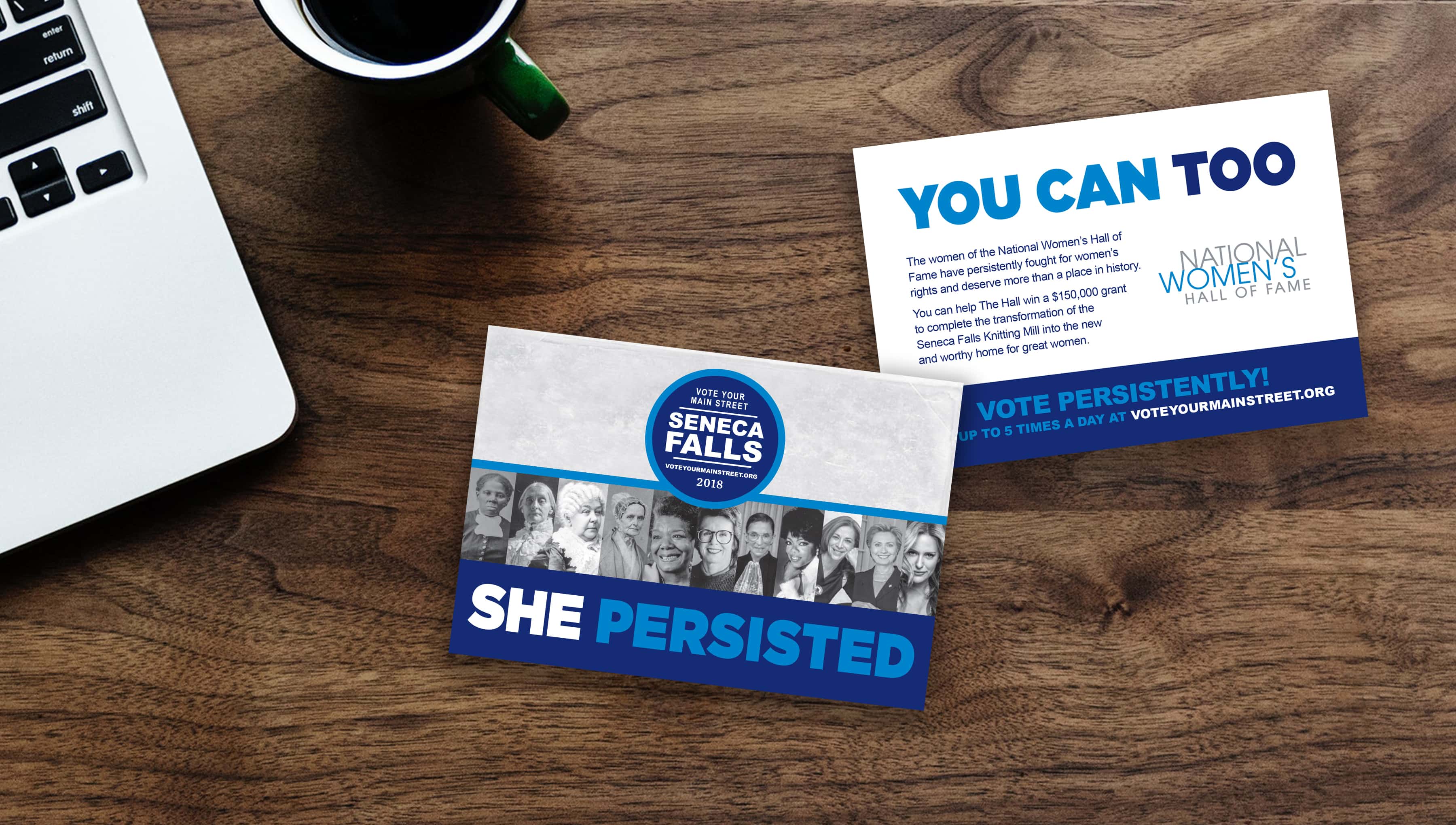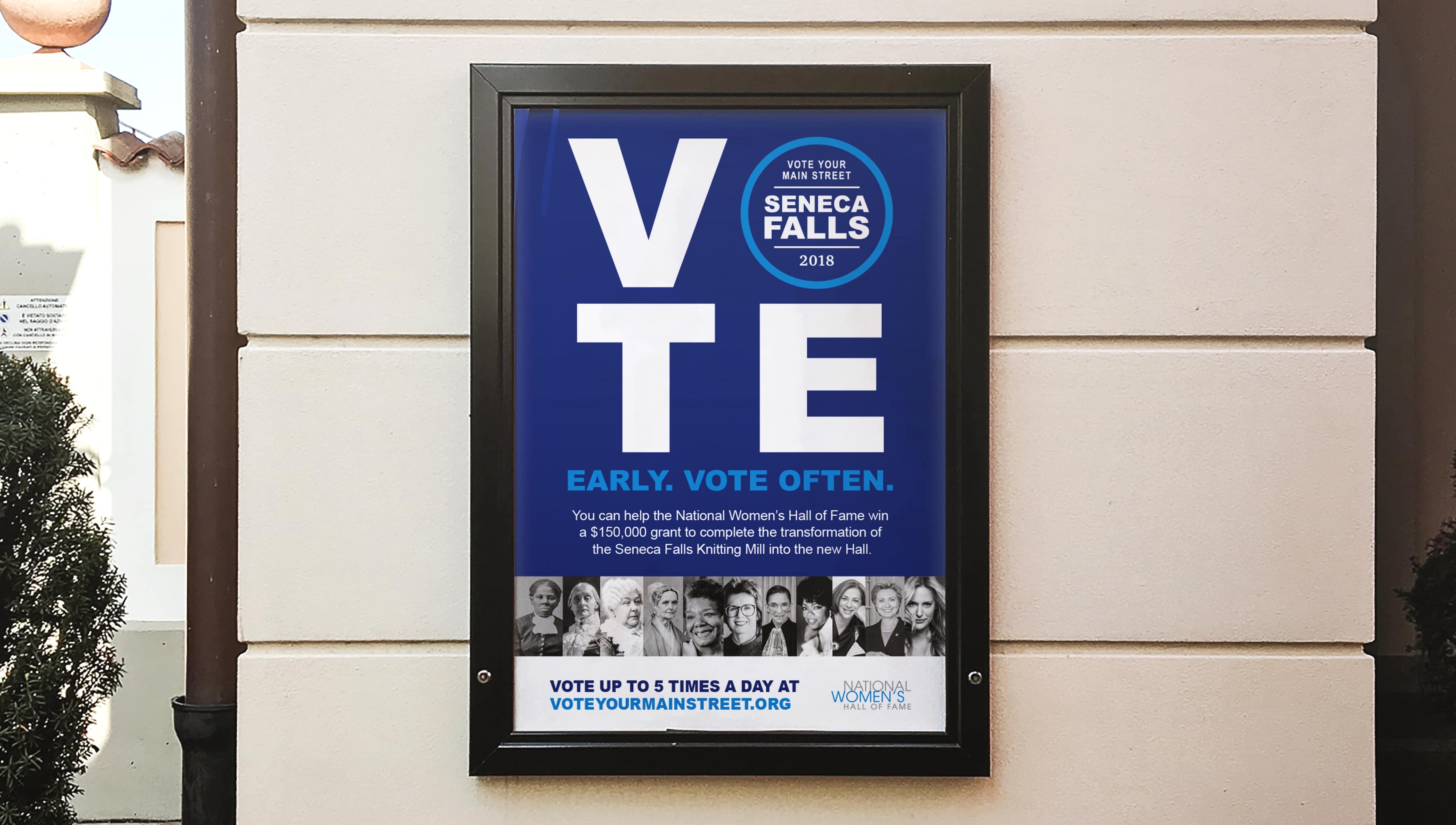 The Hall faces another constant battle—for funding. In a contest sponsored by National Geographic, the Hall competed against other national landmarks across the country for votes and grant funding to help build a permanent and worthy home in the Seneca Falls Knitting Mill that played such an important role in the movement. The Martin Group developed a campaign that used historic women and a recent rallying cry to get people to vote early and often for the Women’s Hall of Fame. As a result, we helped to secure $150,000 for construction.